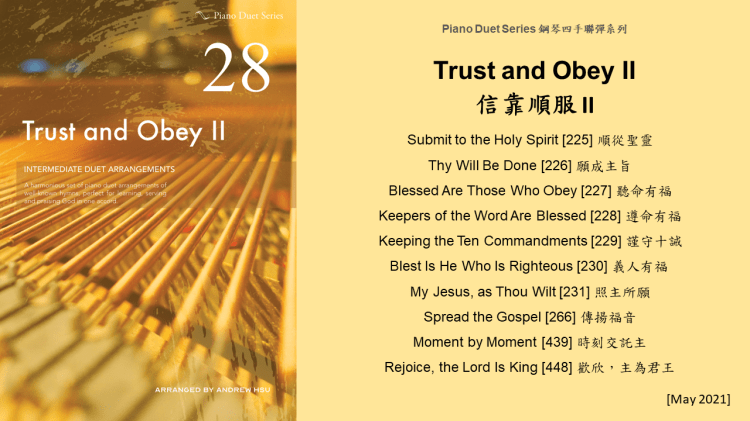Praise the Lord, Piano Duet series Book 28 – Trust and Obey II is out now. More pieces for those who are keen to play new arrangements for four hands with both real and virtual partner.
