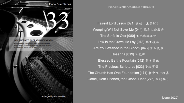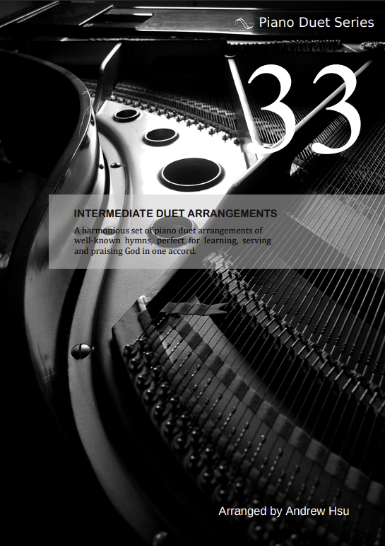 Thanks the Lord that Piano Duet Series Book 33 is out now. Unlike the ones previously completed in the series, this book of many still to come will not be based on a theme. Hopefully in the near future I will have time to do the remaining hymns to complete the cycle. Sincerely wish any budding pianists to have a go at these piano duets at leisure for practice and fun. Praise the Lord!