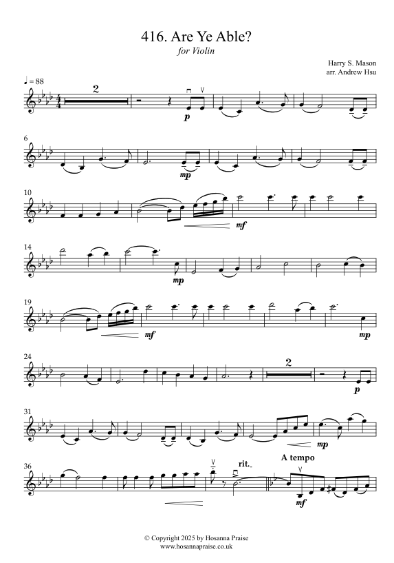 Hallelujah, Praise the Lord! Had another chance to add another to instrumental series. Arrangement of hymn 416 Are Ye Able for violin solo with piano accompaniment. It is a short hymn with only two verses composed by an American Harry S. Mason (1881-1964). In order for us to become a precious vessel use by Lord Jesus, we should strife to be faithful and loyal. A beacon shines forth for the Lord Jesus in our daily life.