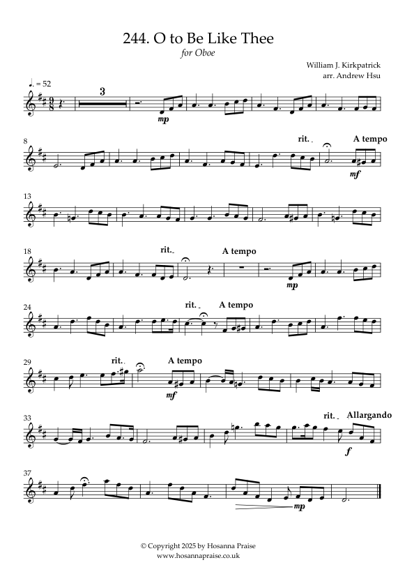 Hallelujah, Praise the Lord! An arrangement of hymn 244 O to Be Like Thee for Oboe and piano. This melodious calm and gentle hymn tells of the love, kindness, mercy and compassion of our Lord Jesus. As His followers, we should strive to wear His perfect likeness and manifest this through our daily living.