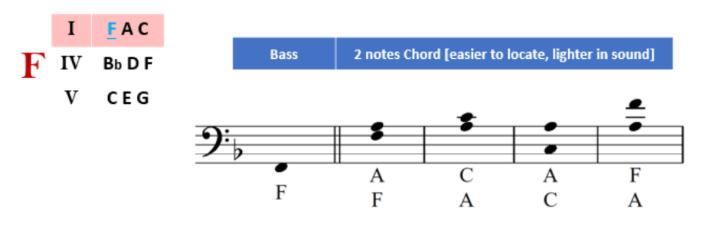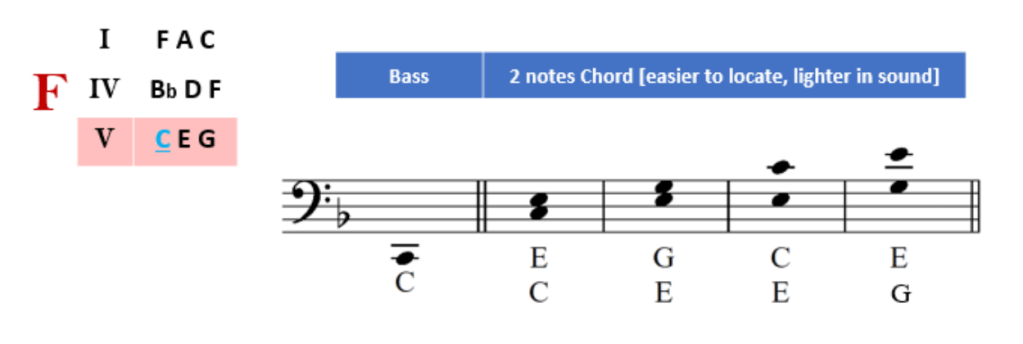 Imagine we are in F major, using chords I, IV and V. The combination of possible 2 notes chord follows by the bass note will be as follow: