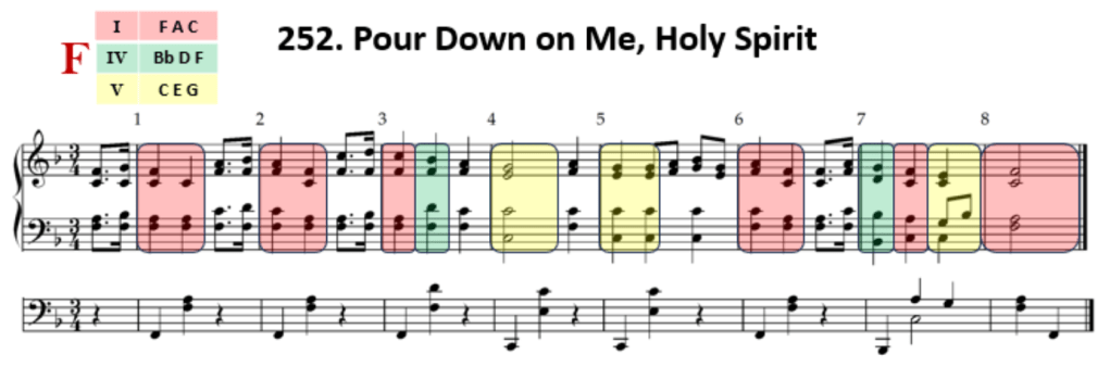 We will use a short example to start with. Hymn 252 is in F major. Analysing bar by bar, first group the notes vertically and work out the harmony. Which chord out of I, IV and V to use. Starting that bar with the bass note follows by one the the four possible chord to go with it. Be careful not to use a chord that is rather high that may clashes with the right hand melody, nor too low towards the left that may sound grumpy. All these need practice, trials and errors.