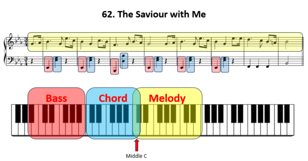 Hymn 62 is one the the few hymns in our hymn book that does not begin with the traditional SATB four parts harmony. This simplify arrangement comprises of right hand main melody, with left hand playing a bass note follows by a two notes chord in each bar.