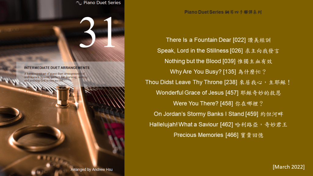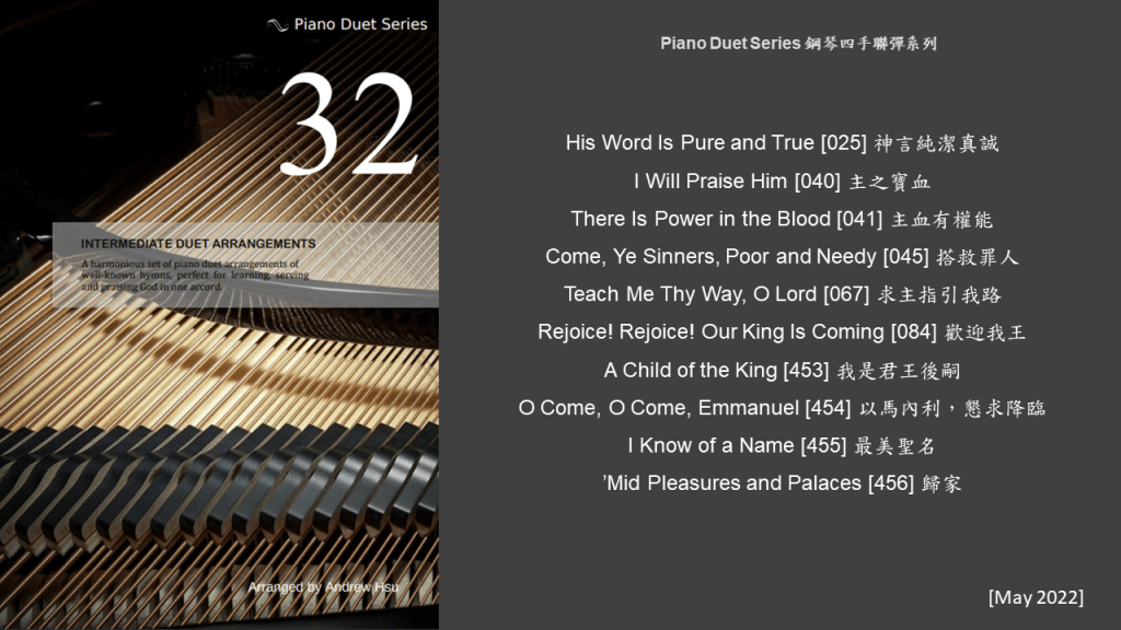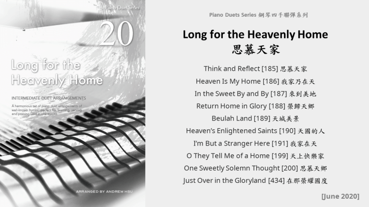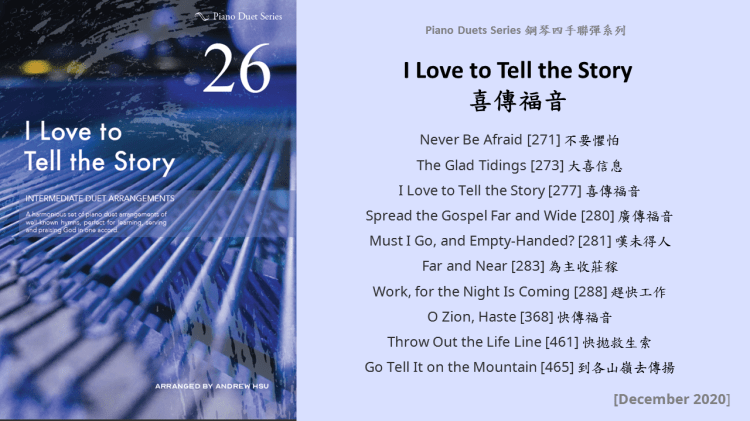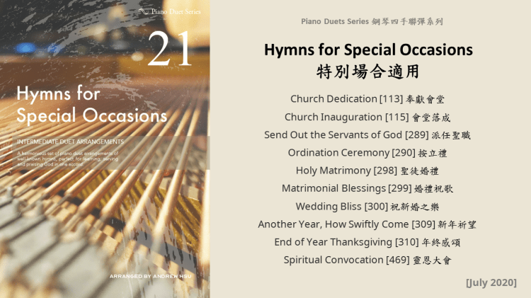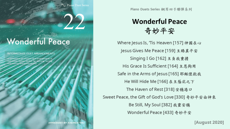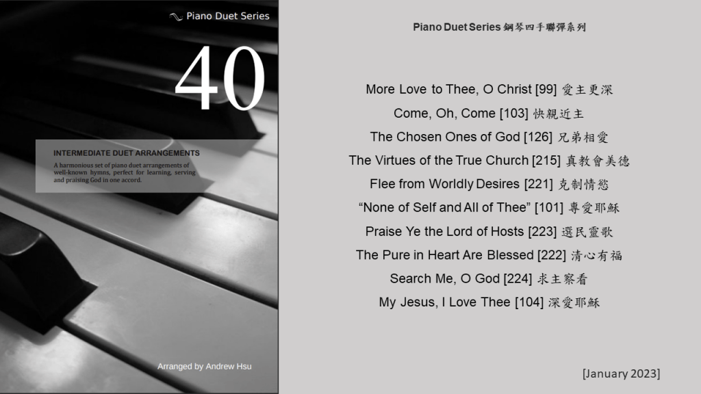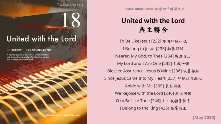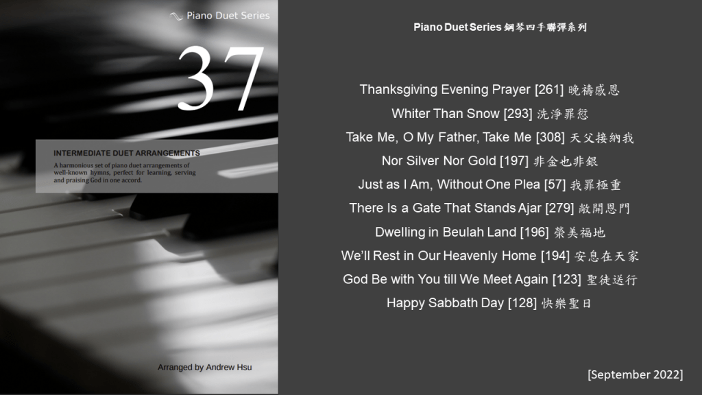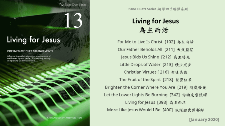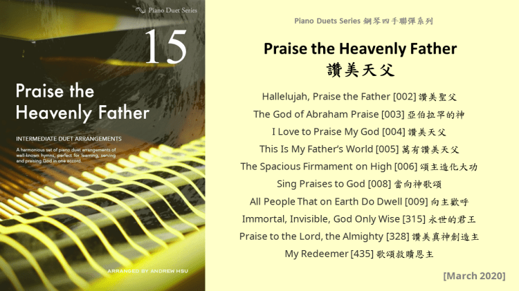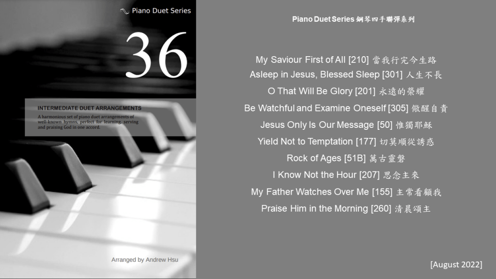 Since completing the Hymns of Praise Easy Arrangements for Piano to allow my twelve-year-old son to learn and play the hymns published by the church, he has always been eager to play the piano along with me. This inspired me to arrange another album for four hands on the piano. In this way, not only are my son and I able to praise God together, but children and youths in church can also enjoy a precious opportunity to use both of their hands to learn, praise and serve God with one accord. Since then, I have time to add more and more books, praise the Lord!